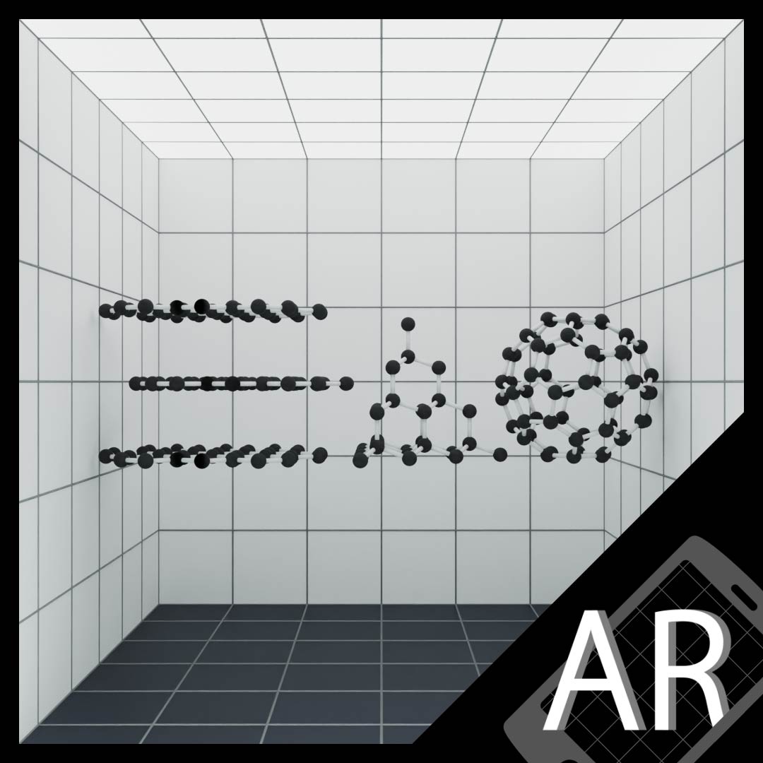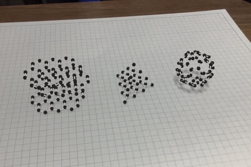 炭素の同素体 2025.09.19 HOME > 化学ARコンテンツ> 炭素の同素体 起動方法 操作方法 COMMENT グラファイト、ダイヤモンド、フラーレンを見ることができます。 その他ARコンテンツ MOF-5 立体核図表 ニューマン投影式 構造式 鏡像異性体 DNA 物質の三態 炭素の同素体 分子結晶 イオン結晶 金属結晶 立体周期表(電気陰性度) 1 2 ›
