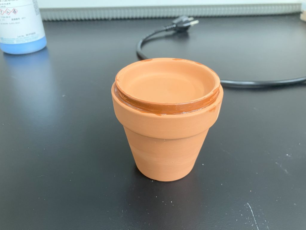 素焼き鉢の広口を素焼き皿で塞ぐため,接着剤で2つをくっけます.接着剤が硬化したら完成です.あとは実験例2の実験手順に従って素焼き容器壁面に膜形成させます.