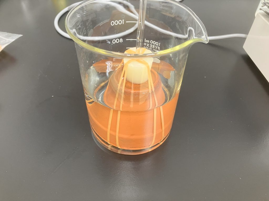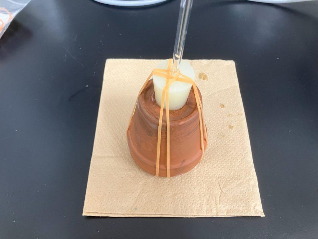 浸透圧の測定をする際は,素焼き容器内を溶液で満たしてからゴム栓を取り付けたガラス管を挿入し,輪ゴムで固定します.このとき固定が甘いと,測定中にゴム栓と素焼き容器の間にできた僅かな隙間から溶液が漏れ出てしまい,水柱の上昇が遅くなります.