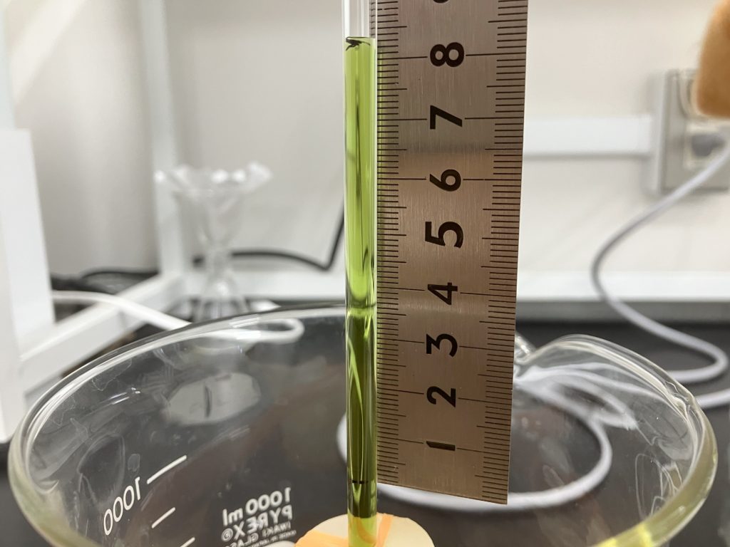 10分後,上昇したガラス管内の液面から,あらかじめつけておいた印までの長さを測る.