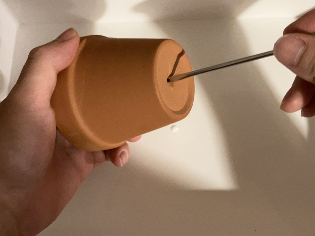 素焼き鉢の細口にガラス管が通るか確認します.もし通らなければドライバー等で削って口を広げましょう.