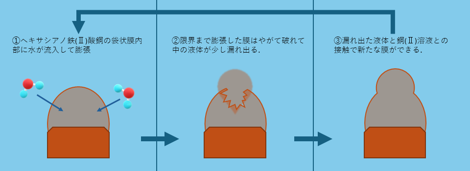 ドイツの植物学者トラウベは,1864年にヘキサシアノ鉄(Ⅱ)酸カリウム結晶と硫酸銅水溶液を使って,後に「トラウベの人工細胞」と呼ばれる実験を発表しました[1].半透膜の性質を紹介するのに良い実験となっております.
