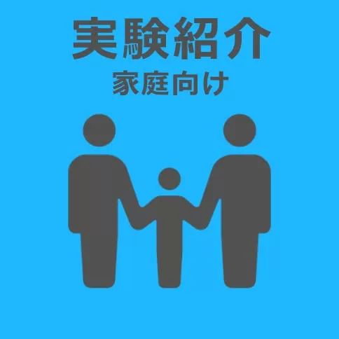 実験紹介-家庭向け- 2024.03.012025.07.17 HOME>実験紹介>家庭向け ご家庭でなるべく安全に実践できる実験を紹介します。夏休みの自由研究などにいかがでしょうか?※安全のため実験は保護者の監督のもと行いましょう。※万一ケガなどの事故が起こった場合、責任を負いかねます。 自由研究ネタ期間限定で公開中! EH016 アンモニアソーダ法 EH015 ハイポで過冷却 EH014 酸素を集めよう EH013 スライムづくり EH012 ブルーボトル反応 EH011 水質の浄化 EH010 表面張力計 EH009 キッチンリトグラフ EH008 お手軽光化学 EH007 クエン酸レモネード EH006 マジックサンド EH005 スチールウール燃焼 EH004 蛇玉 EH003 シソの色変 EH002 DNA抽出 EH001 果物ミイラ